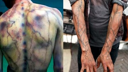 Примерно так выглядит человек, в которого ударила молния. Через его тело проходит очень сильный разряд.