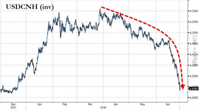 За последние три месяца курс офшорного юаня к доллару снизился на 6%, при этом только за последние две недели потери составили около 4%.