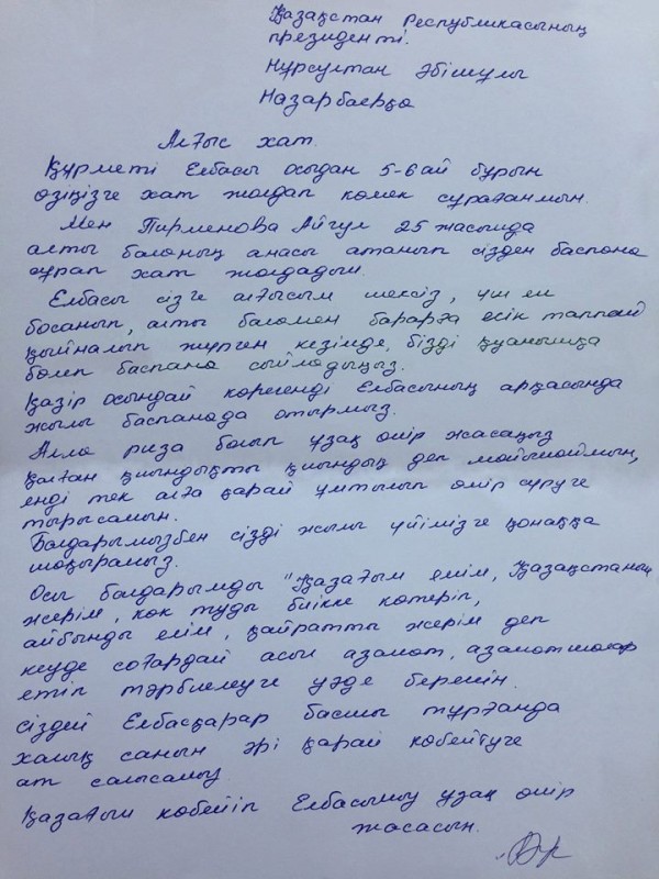Письмо Айгуль Пирменовой опубликовано на официальной странице AkordaPress в Facebook.