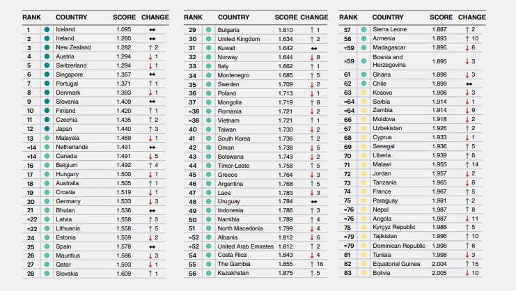 Город-государство занимает 6-е место в мире по индексу, сразу за ним следуют Португалия, Дания, Словения и Финляндия.