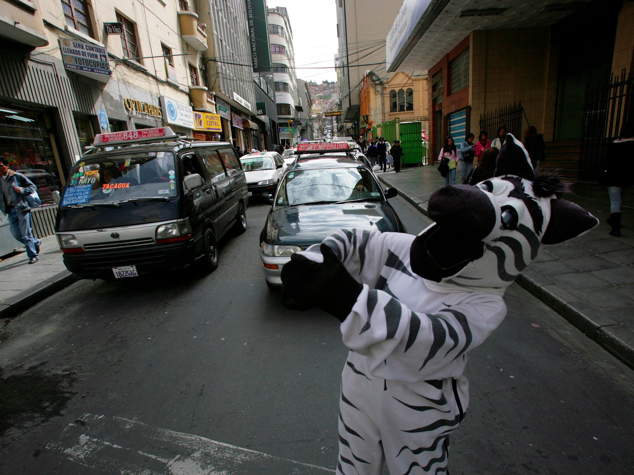 Боливия: Трафик зебра В Ла-Пасе (Боливия) люди одевают костюмы зебр и помогают пешеходам переходить дорогу.