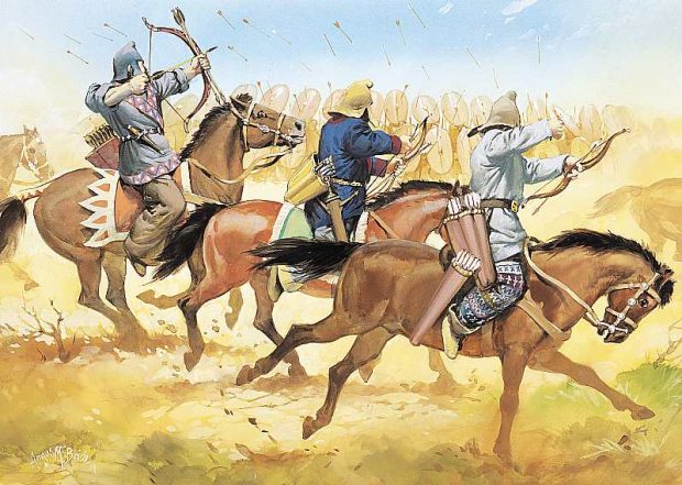 Ғұндардың әскери жасақтарының негізі – атты әскер еді. Атты әскер садақпен, семсер, қанжар, найза, бұғалықпен қаруланған. Садақтың ұшына үш қырлы темір жебе қадады. Сауыт бұзар жебе де болды. Ғұндардың жауынгерлік құдіретінен сескенген қытайлар Ұлы Қытай қорғанын салдырған.