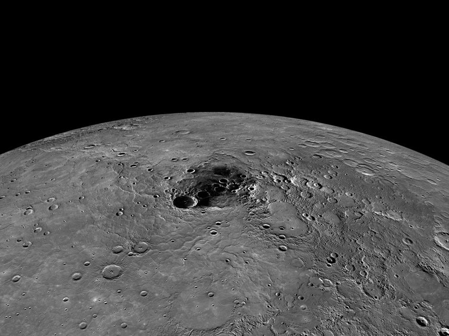 (Меркурий (снимок «Мессенджера»). У правого края в южном полушарии виден кратер Толстой)