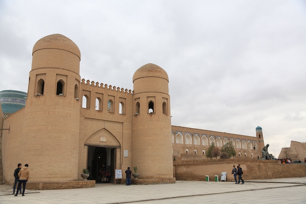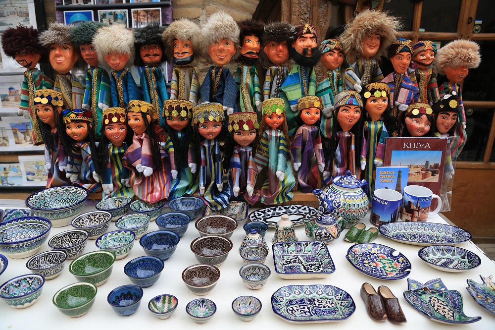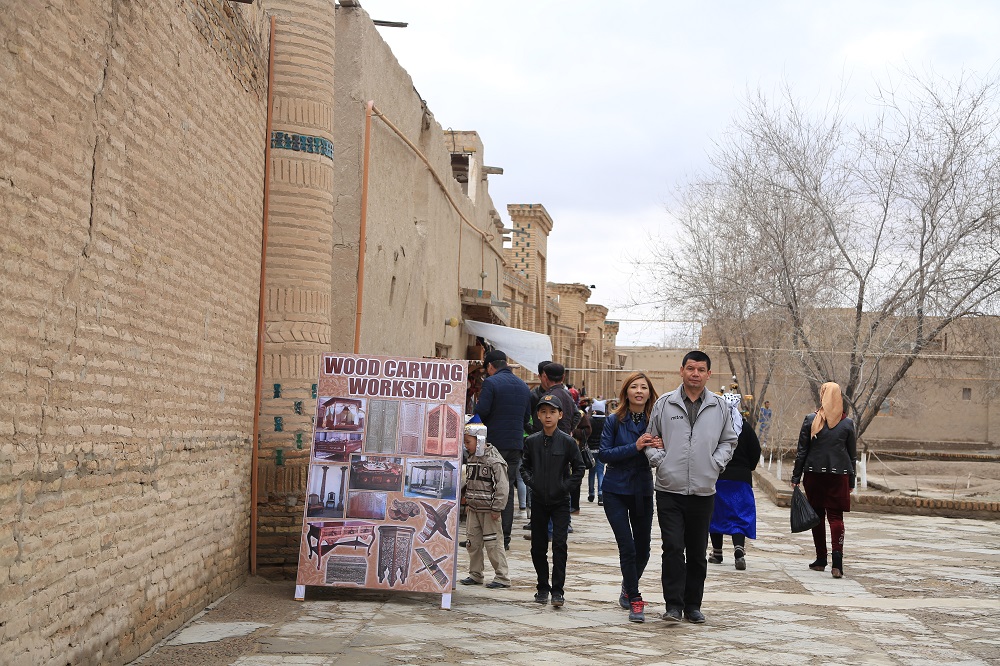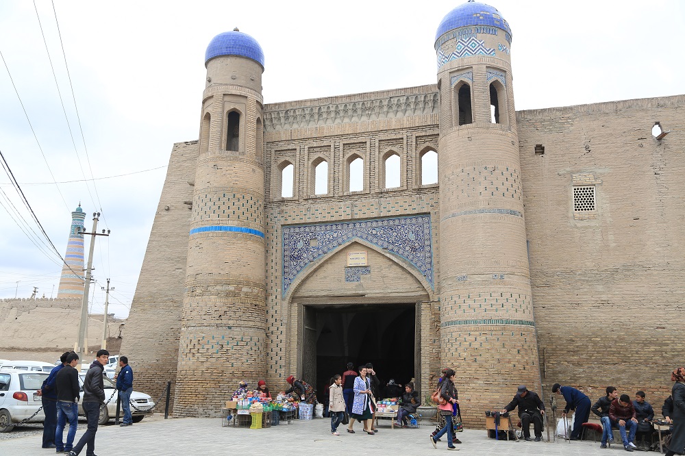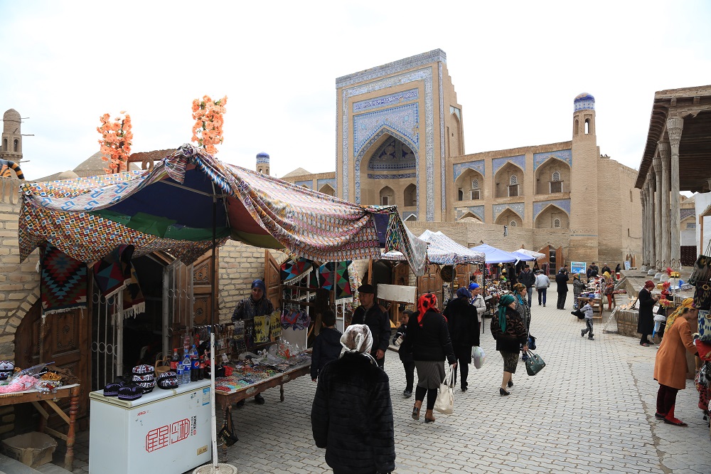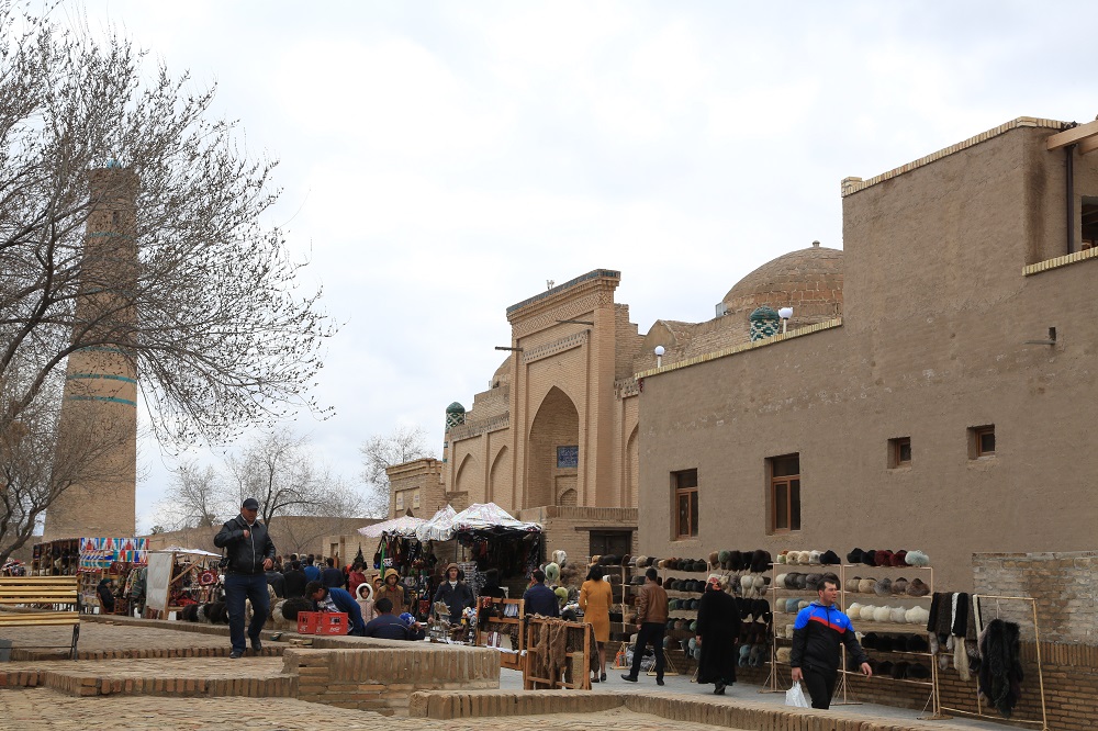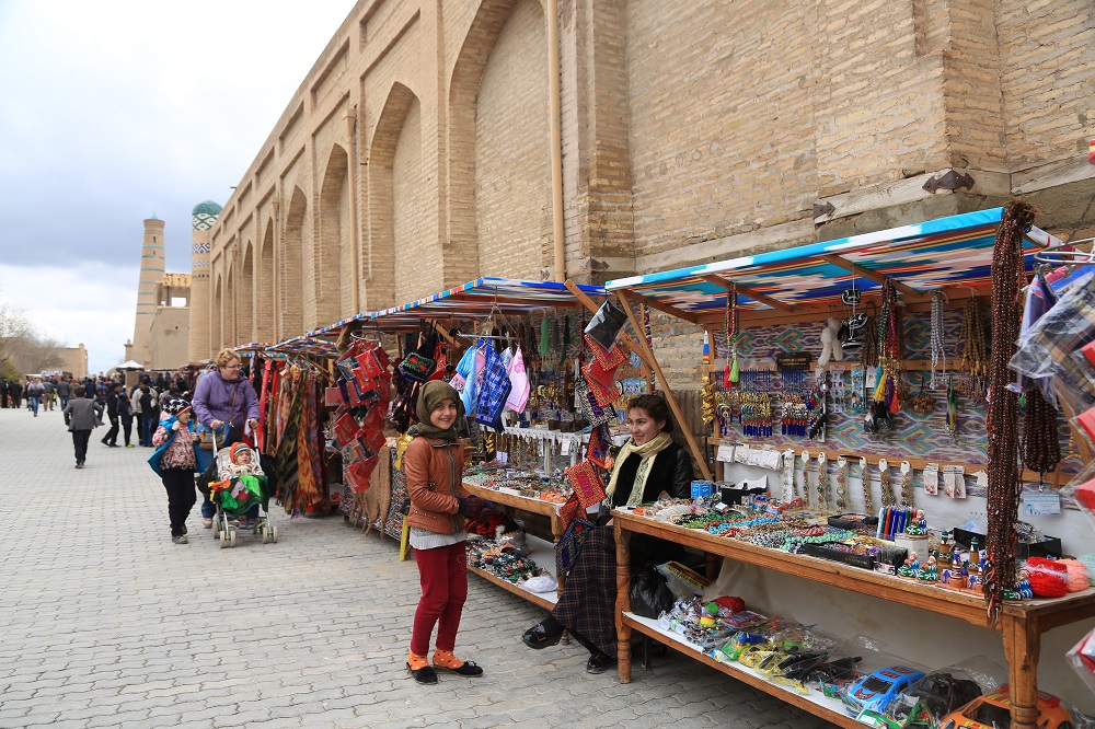 Ескі қаланың қақпасынан ене бере-ақ, бізді осындай көрініс қарсы қалды. Ескерткіш сыйлықтар, сувенирлер, өзбектің ұлттық киімдерін сатып тұрған саудагерлер баршылық.