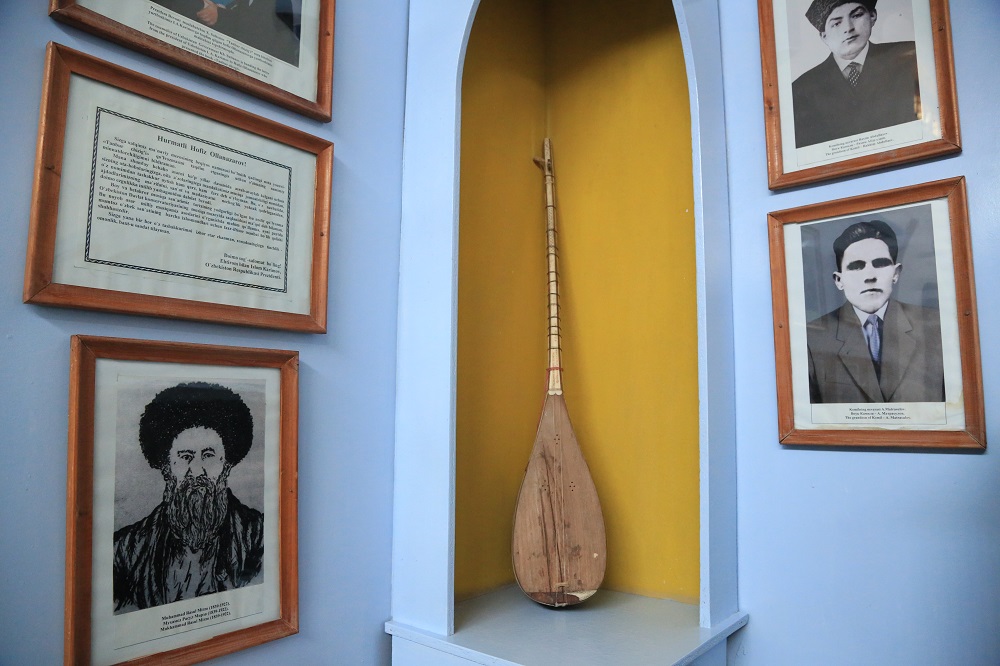 Мұнда ғалымның өзі ойлап тапты делінетін домбыра секілді аспап қойылған.