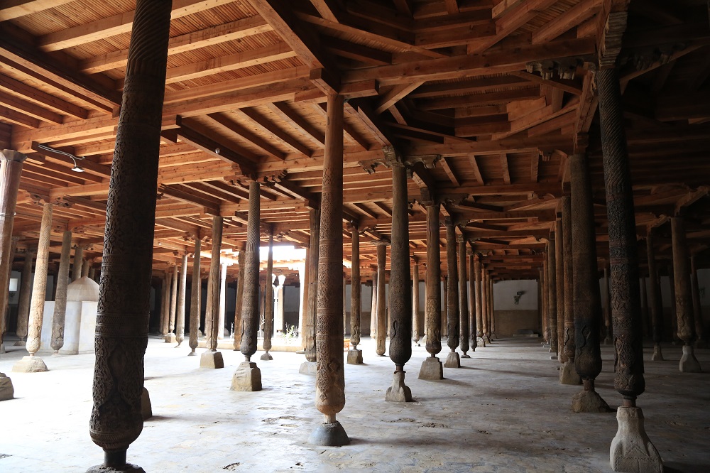 Бұл Хиуа қаласындағы әйгілі "Жұма" мешітінің ішкі көрінісі. Кезінде айналадағы күллі мұсылман жамағатының құлшылық етер орталығына айналған мешіттің көркемдігіне көзің тоймайды.