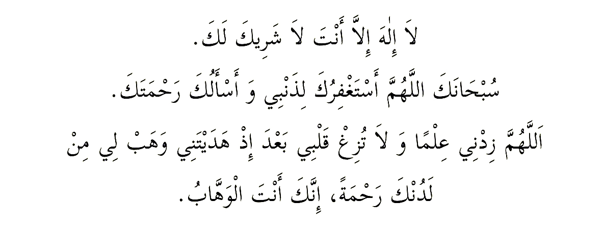 Оқылуы: Лә иләәһә иллә әнтә лә шәриикә ләкә субхаанәкә Аллаһуммә астағфирукә ли-зәнби уә әс'әлукә рахмәтәкә. Аллаһуммә зидни ‘илмән уә лә тузиғ қальби ба‘дә из һәдәйтәни уә һәб ли мин ләдункә рахмәтән иннәкә әнтәлУәһһәәб.