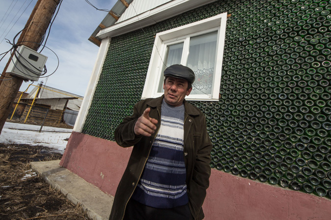 Ресей Федерациясының Челябі облысындағы Течен елді-мекенінің тұрғыны Хамидулла Елшібаев ауданы 99 шаршы метрді құрайтын үй тұрғызу үшін 12 мың шампан шөлмегін пайдаланған. Кірпіш орнына. Оның құрылысына үш жыл кеткен. Осынау өзгеше жобаны баспанаға мұқтаждықтан емес, 2007 жылы қаза тапқан ұлының шыныдан үй салсам деген арманын орындау үшін қолға алған. Қажетті материалды шыны ыдыстарды жинайтын арнайы пунктен әр данасын 1 рублден сатып алған. Шыныдан қаланған екі қабатты үйдің бірінші қабатында асүй, дәліз, төрт бөлме, ал екінші қабатында жатын бөлмесі бар. Бұл жайында metrinfo.ru ақпарат көзі хабар таратты.