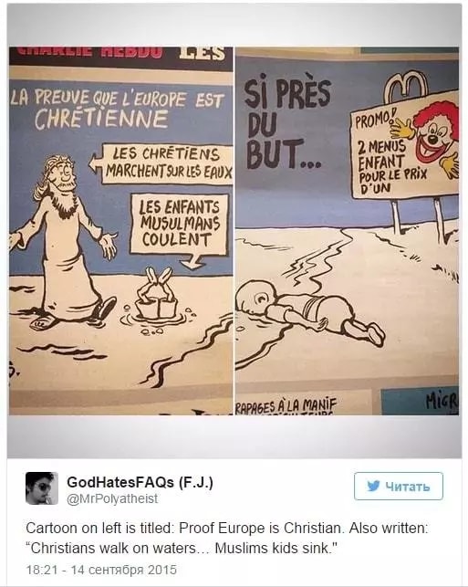 Француздық Charlie Hebdo журналы тағы да қоғамның наразылығын тудырды. Таяуда босқындар мінген кеме суға кетіп, Түркия жағалауынан жас баланың жансыз денесі табылған еді. Сатиралық басылым жұрттың аяушылығын тудырған осы оқиғаға қатысты келемеж карикатура жариялаған.