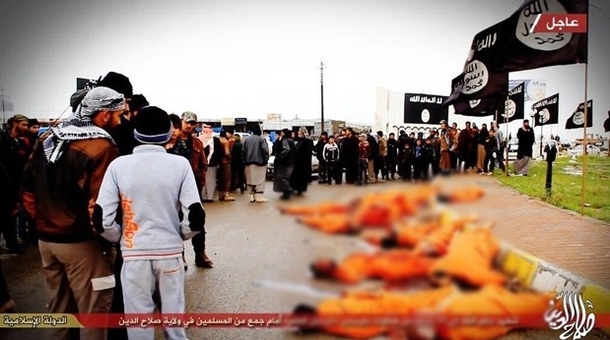 Бұқаралық ақпарат құралдарына ИСИМ-нің тағы бір сойқан көріністері шықты. Ақпарат беттерінде жарияланған бұл фотоларда ИСИМ содырларының сарғыш-қызыл түсті киімдер кигізіп қойған он үш адамды өлім жазасына кесіп жатқаны көрінеді. Фотодан тапаншамен бастарына оқ дарытып, қатарынан бәрін сұлатып салған бұл көріністі халықпен қоса, кішкентай балалардың да «тамашалап» тұрғанын көруге болады. Өңкей қара киінген содырлардың ешқайсысының жүзі көрінбейді, бәрі тұмшаланған.