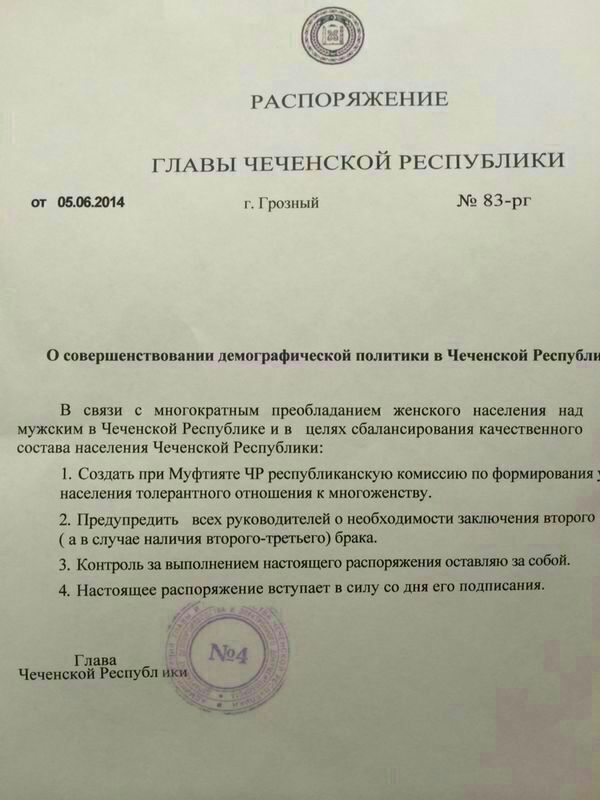 Маусымның 5-не қабылданған бұл заңда: «Шешенстан Республикасында әйелдер санының еркектердікінен артуы сөз болып, осыған байланысты муфтият жанынан арнайы комиссия құру тапсырылған. Сондай-ақ барлық жетекшілерге екінші немесе үшінші әйел алу керектігін тілге тиек еткен.