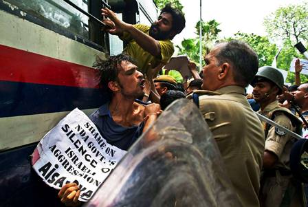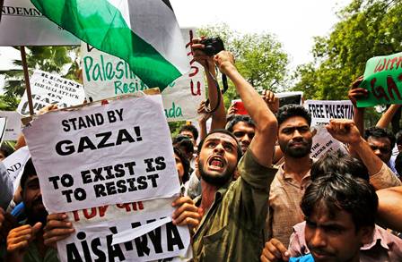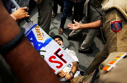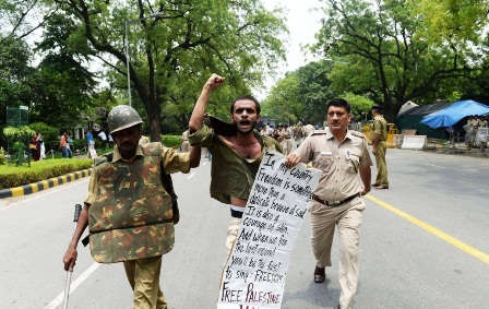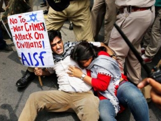 Үндістан астанасында Израилдің Газа секторындағы басқыншылығына наразылық білдіріп шеруге шыққан тұрғындарды полиция қызметкерлері күш қолданып, аяусыз ұрып-соқты. Онымен қоймай, шеруге шыққандарды тұтқындап әкеткен. Олардың 45-і ер адам болса, 14-і – әйелдер. Белсенділер Қытайдың ядролық қаруынан қорғану үшін Үндістанның Израилмен стратегиялық әріптестік орнатып, зымыранға қарсы қорғаныс бойынша интеграцияғабарғанына да наразы.