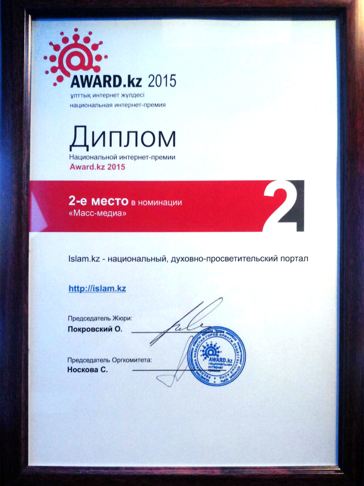 Қазақстандағы интернеттің дамуына үлес қосу мақсатымен құрылған «AWARD.kz» Ұлттық интернет-премиясы 2002 жылдан бері үздіктерді 13 номинация бойынша марапаттап келеді. Алғашқы жылдары байқауға қатысқан сайттардың саны саусақпен санарлық болса, биыл 708 үміткер өтініш білдіріп, оның арасынан 137 сайт пен 10 мобильді бағдарлама ғана келесі айналымға өткен. Финал еліміздегі ең үздік сайттардың арасында болды. Қазақстандағы алпауыт бұқаралық ақпарат құралдары қатысқан қазақ және орыс тілдеріндегі сайттардың арасынан діни порталдың осындай жүлдеге ие болуы бүкіл мұсылмандар үшін қуанарлық жағдай.