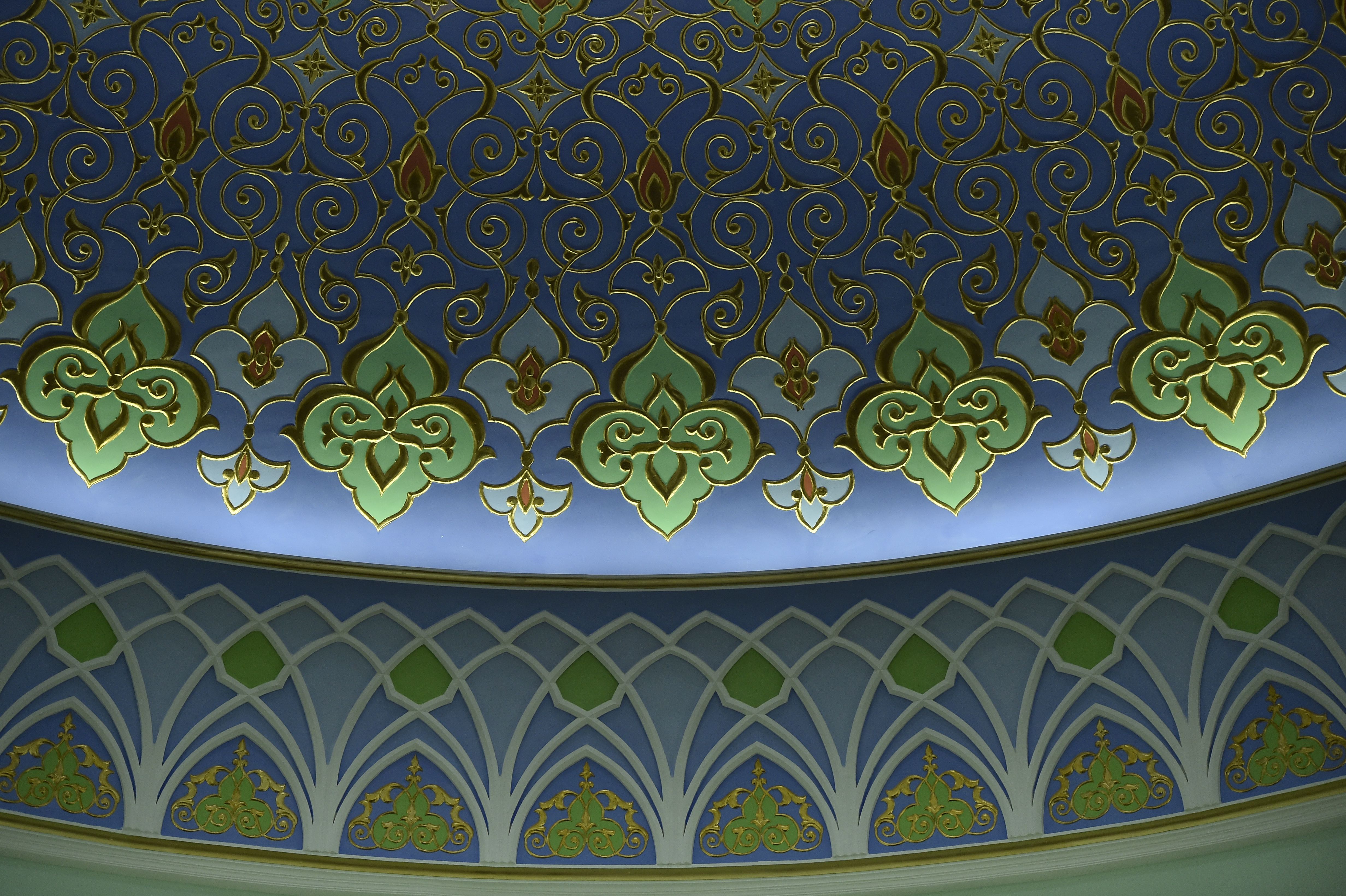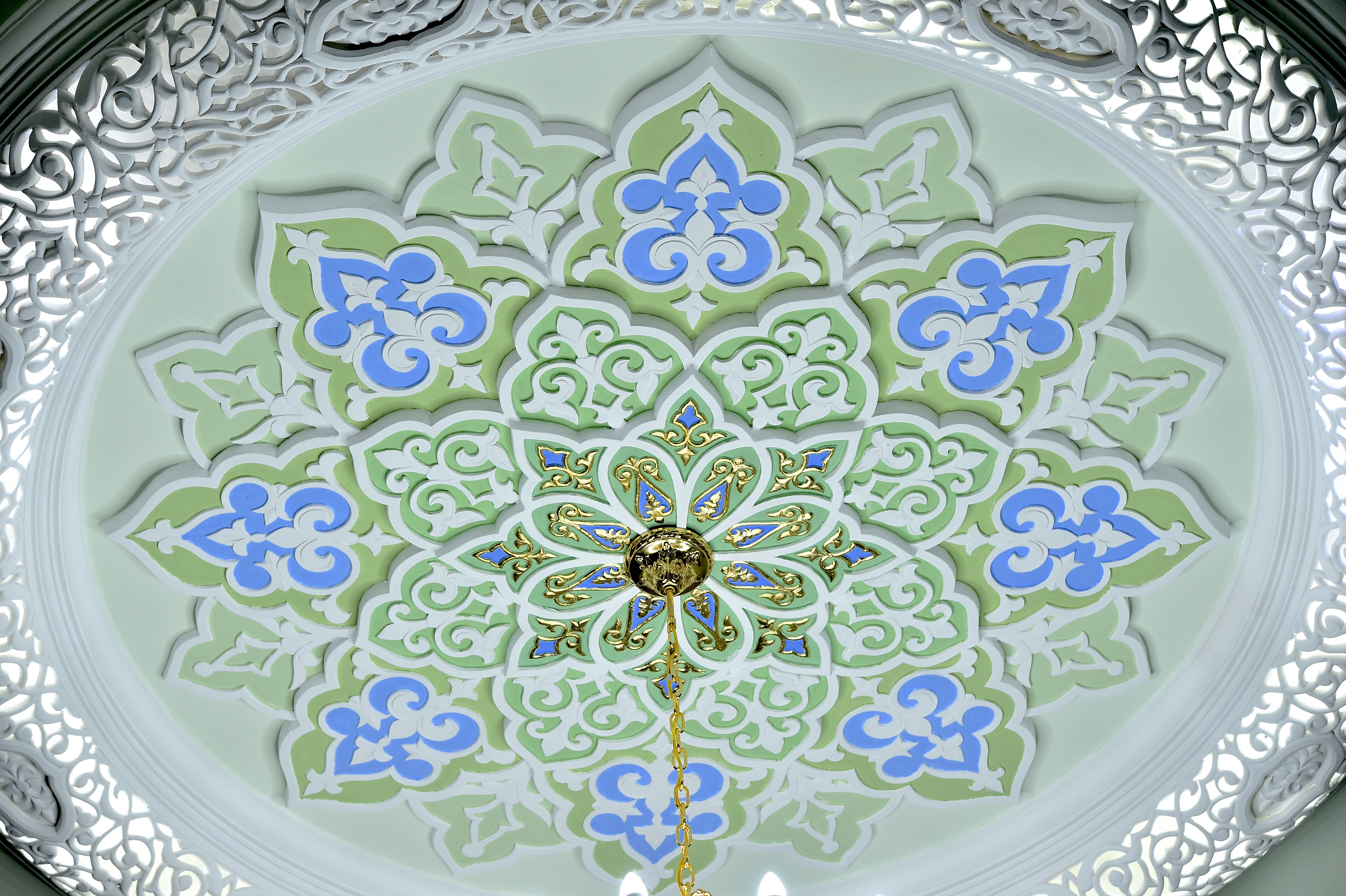 Күмбездің тотықпайтын алтын түстес сары қаңылтыры балық қабыршығының көрінісін білдіретін өрнекпен өрнектелген. Күмбез ішіне «Фатиха» сүресі жазылып, бұған қосымша мешіт михрабының көрінісі бейнеленген. Михрабта «Аятул курси» сүресі өрнектелген.