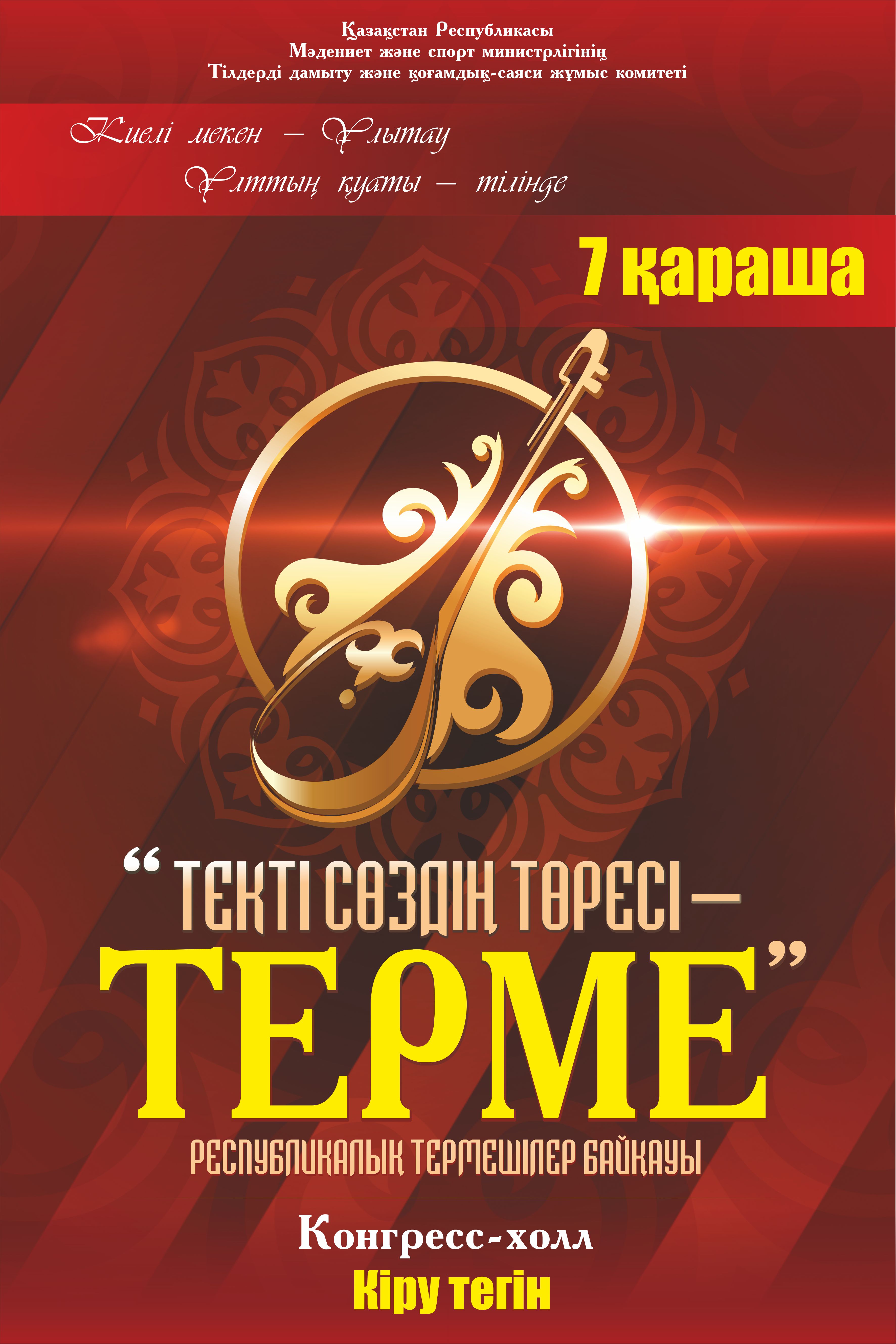 Биыл «Текті сөздің төресі – терме» атты республикалық термешілер байқауы ұйымдастырылмақ. «Текті сөздің төресі – терме» республикалық байқауы Қазақстан Республикасы Мәдениет және спорт министрлігі Тілдерді дамыту және қоғамдық-саяси жұмыс комитетінің жыл сайын тұрақты түрде өткізетін іс-шарасы болып табылады.