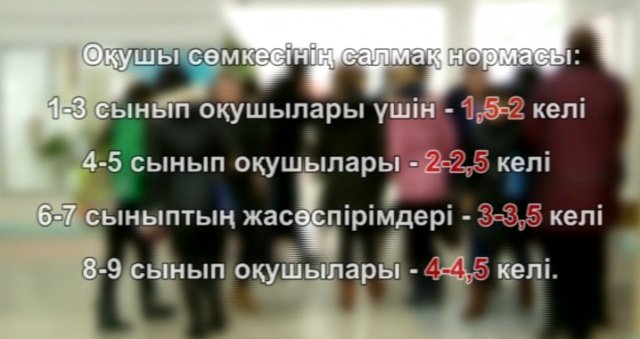Оқушы сөмкесінде, әдетте, мектеп құралдары, кітап-дәптерлері ғана болуы тиіс. Бірақ, қазіргі оқу бағдарламасына сәйкес күніне 5-6 сабақ болғанда оқушы осы пәндердің оқулықтарын түгел алып келетін болса, салмақтың артық болары да жасырын емес. Ал бұл балалардың денсаулығына зиян дейді мамандар.