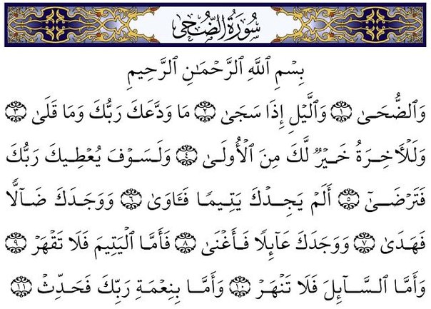 Клянусь предполуденным временем (1) и ночью, когда все успокаивается, (2) Твой Господь (о Пророк) не оставил тебя и не гневается на тебя. (3) И будущая жизнь гораздо лучше для тебя, чем настоящая. (4) И, разумеется, твой Господь дарует тебе так много, что ты будешь доволен. (5) Разве Он не нашел тебя сиротой и не дал тебе приют? (6) И Он нашел тебя не знающим пути (Шариата) и затем наставил тебя. (7) И Он нашел тебя нуждающимся и затем освободил от нужды. (8) Поэтому, что касается сироты, то не притесняй его, (9) и, что касается просящего, не отгоняй его, (10) и, что касается даров твоего Господа, то рассказывай об этом. (11)