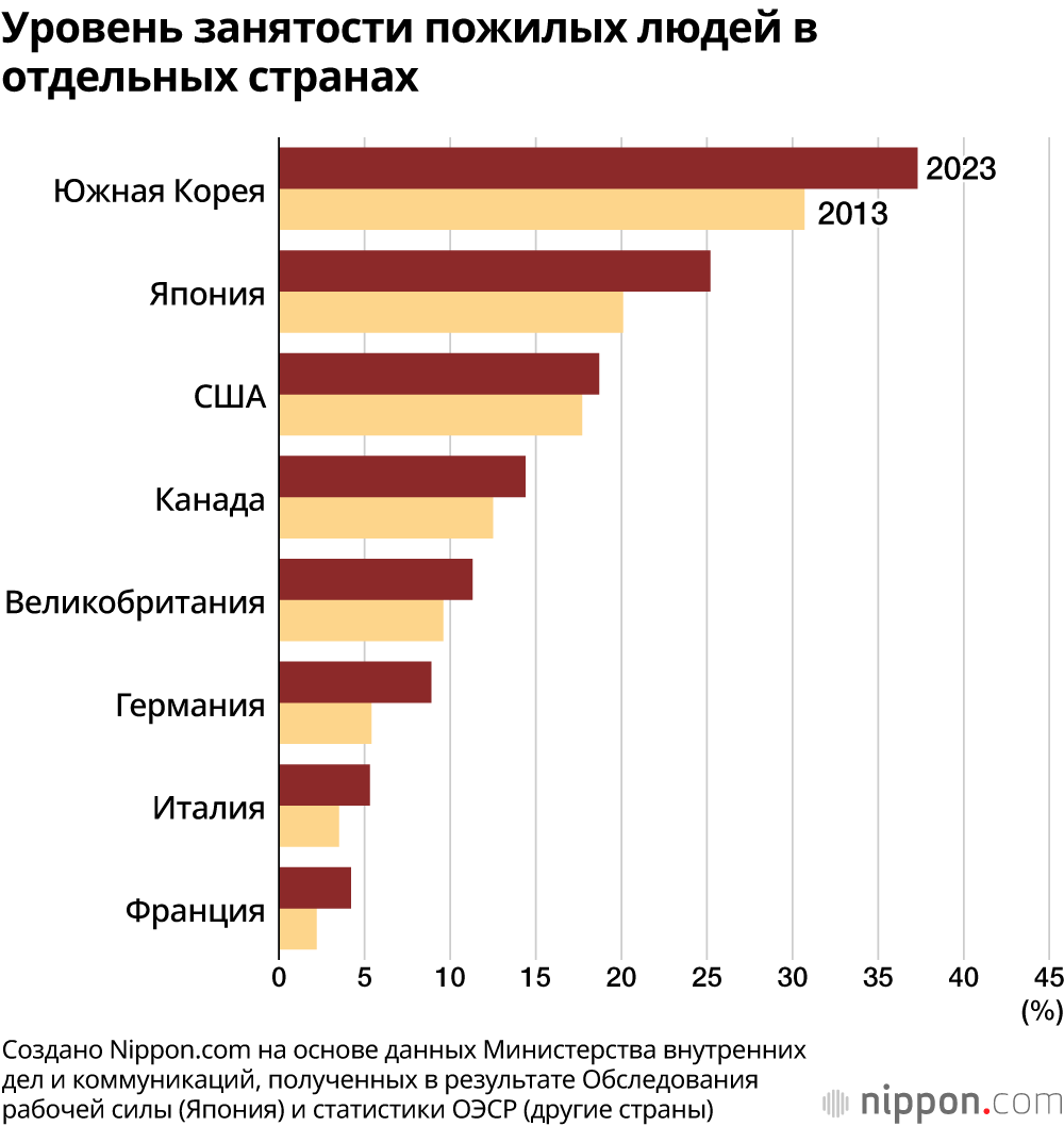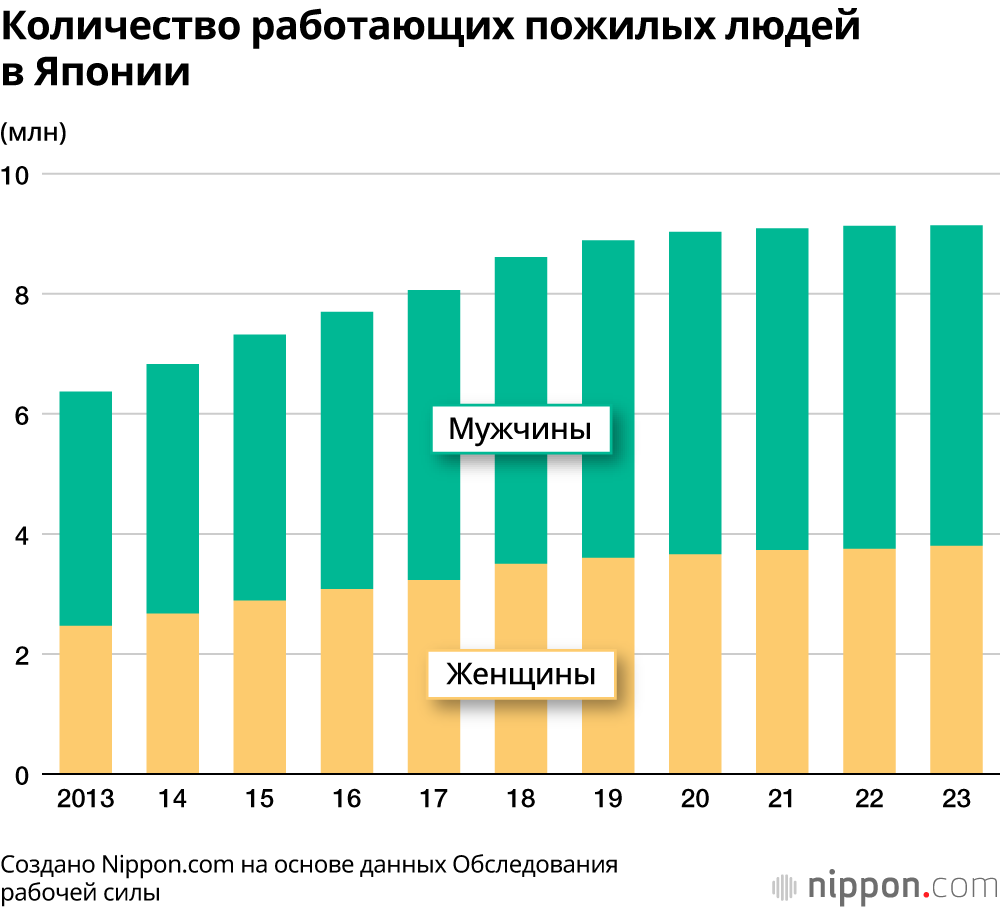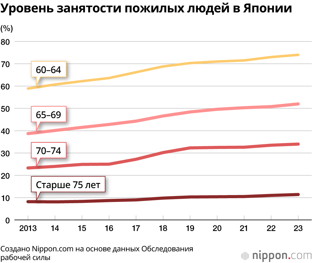 Старение населения Японии отражается на составе ее рабочей силы. В 2023 году в стране насчитывалось 9,1 миллиона работников в возрасте 65 лет и старше. Уже двадцатый год подряд это число стабильно растет, превышая показатели каждого предыдущего года. По отраслям наибольшее число работников приходится на оптовую и розничную торговлю – 1,3 млн человек, далее следуют здравоохранение и социальное обеспечение – 1,1 миллиона человек и сфера услуг – 1,0 млн человек. По сравнению с ситуацией 10 годами ранее в сфере здравоохранения и социального обеспечения стало в 2,4 раза больше пожилых работников, причем особый рост наблюдается в сфере сестринского ухода. Соотношение пожилых людей к общему числу работников в возрасте 15 лет и старше составило 13,5 %, то есть возраст каждого седьмого работника превышает 65 лет.