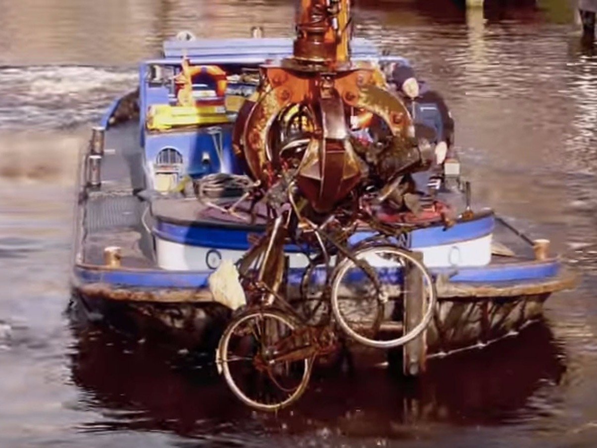 Нидерланды: Экскаваторщик велосипедов В Амстердаме обычно путешествуют с велосипедом. Но в конечном итоге они оказываются в воде, и экскаваторщик велосипедов использует гидравлические когти, чтобы вытащить около 15000 велосипеды из воды каждый год.