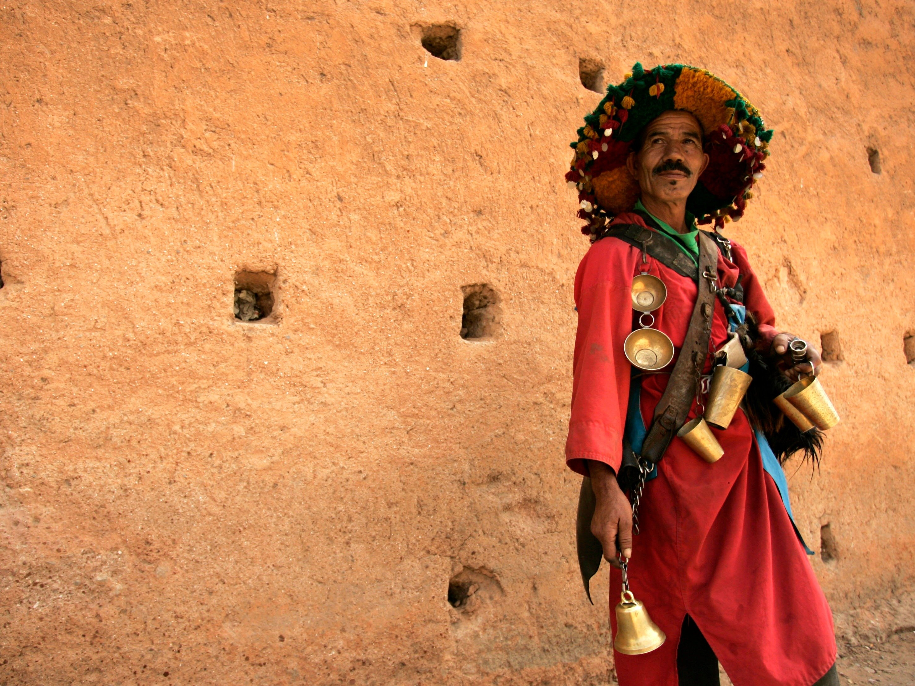 Марокко: Продавец воды В популярных туристических районах Марокко, красочно одетые продавцы обеспечивают водой из верблюжьей кожи сумки и медных чашек.